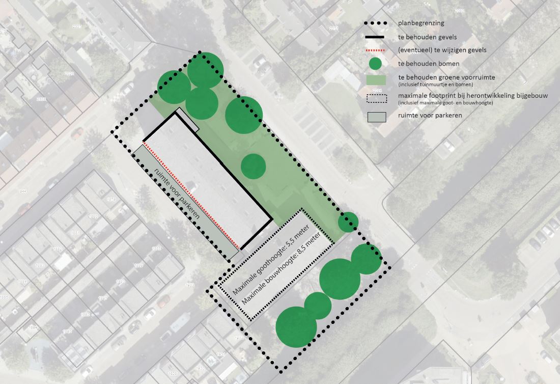 Er mag slechts ten dienste van de bestemming worden gebouwd en er zijn bouwwerken, geen gebouwen zijnde toegelaten, zoals lichtmasten, speeltoestellen e.d.