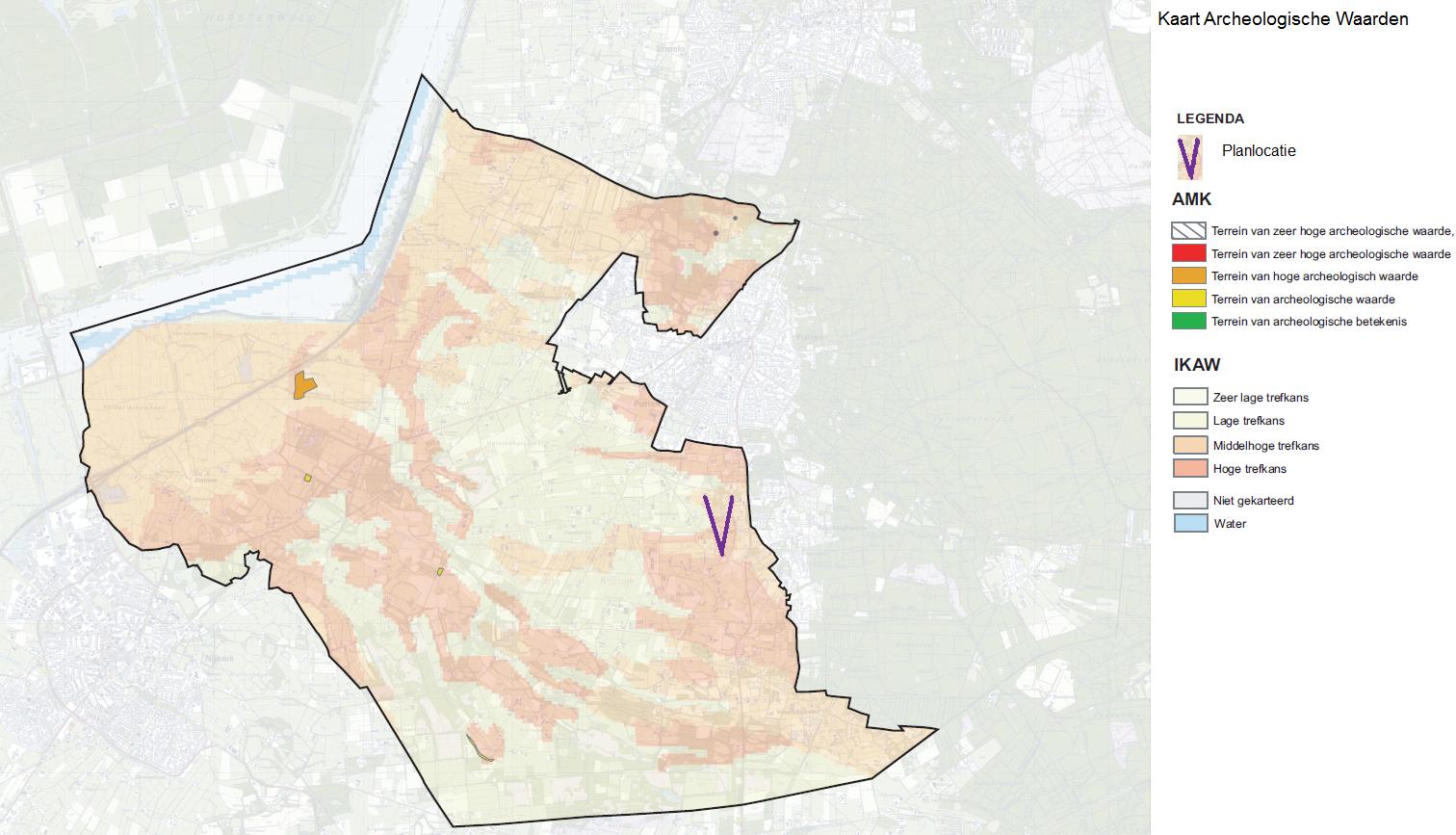 Op de volgende afbeelding is een uitsnede van de archeologische verwachtings- en beleidsadvieskaart opgenomen. Het plangebied valt binnen een gebied met een hoge archeologische verwachtingswaarde.